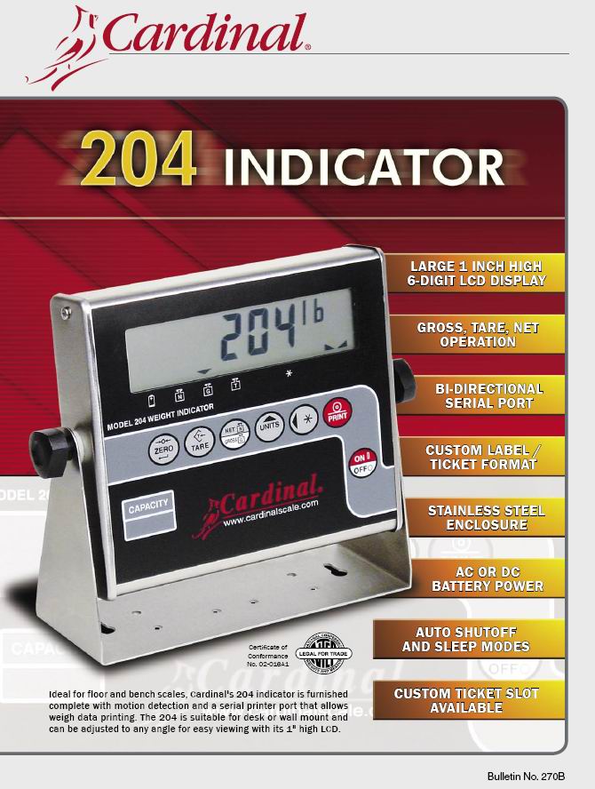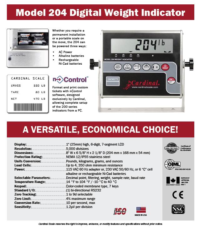 Cardinal 204 稱重顯示儀表(indicator) 規格: