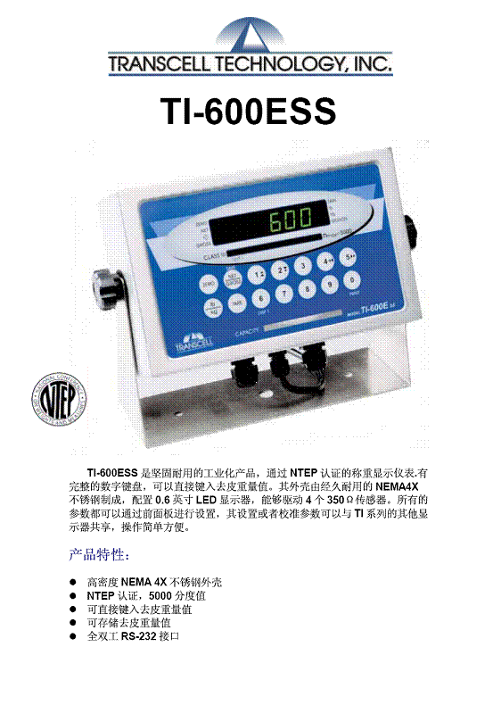 | 產(chǎn)品名稱:Transcell T1-600ESS 化工稱重顯示儀表(Indicator) |