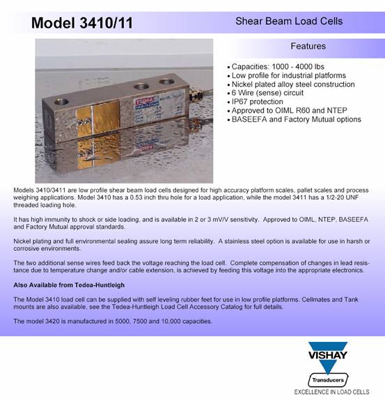描述:3410是為高精度平臺秤、手推秤、過程稱重設(shè)計的低截面剪切梁傳感器。抗震動或偏載能力強,靈敏度2mv/v或3mv/v。通過OIML和NTEP認證。在危險環(huán)境下使用,可以選擇EEX ia IIC T6認證的產(chǎn)品。