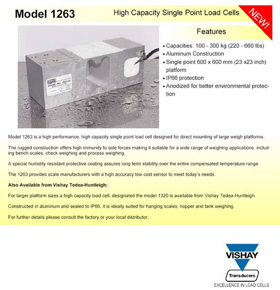 描述:1263是為大尺寸平臺秤設(shè)計的直接安裝的高性能高量程單點式傳感器。這個結(jié)構(gòu)保障了高的抗偏載能力,使得1263有廣泛的應(yīng)用領(lǐng)域,包括臺秤、分選秤、吊掛式電子秤和過程稱重。